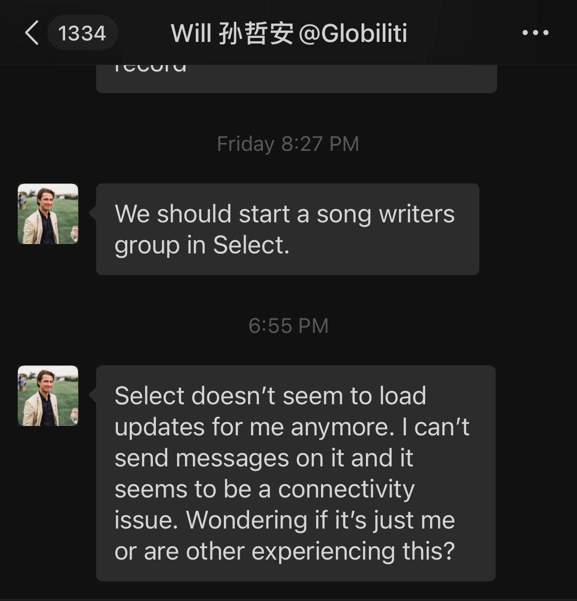 ?! “Select doesn’t seem to load updates for me anymore. I can’t send messages on it and it seems to be a connectivity issue. Wondering if it’s just me or are other experiencing this?”