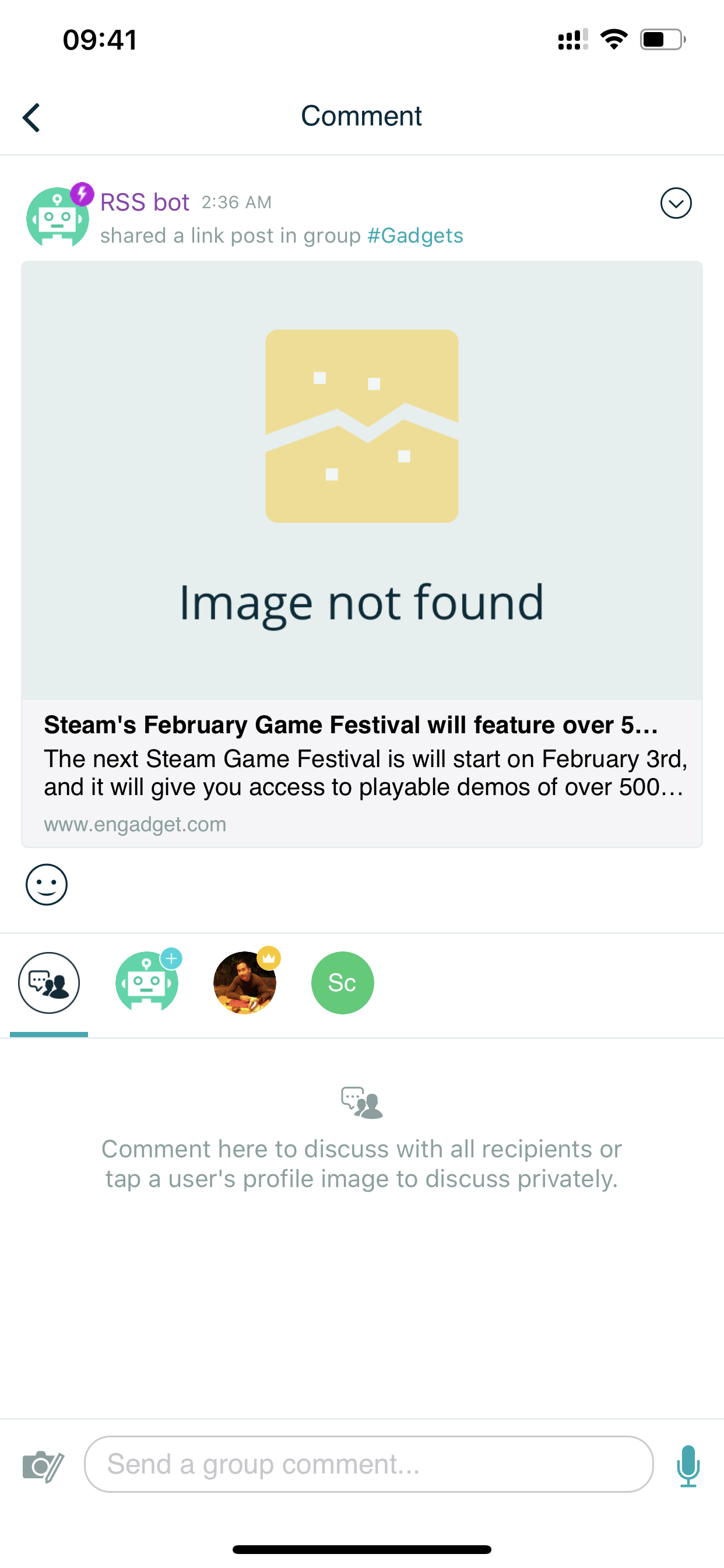 Comment here to discuss with all recipients or tap a user's profile image to discuss privately.