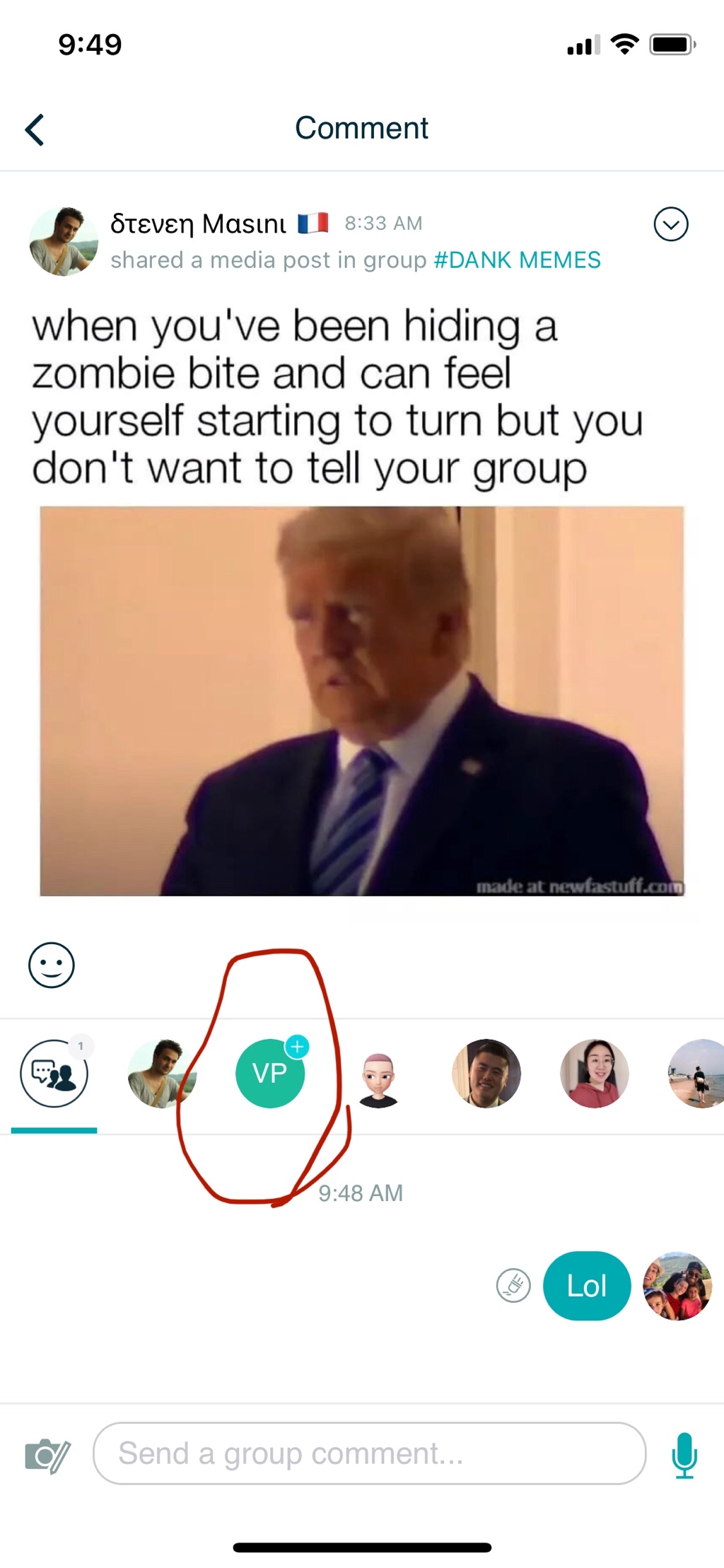 Comment here to discuss with all recipients or tap a user's profile image to discuss privately.