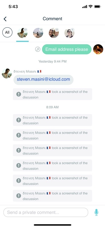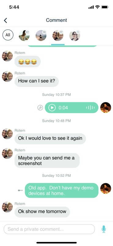 Comment here to discuss with all recipients or tap a user's profile image to discuss privately.