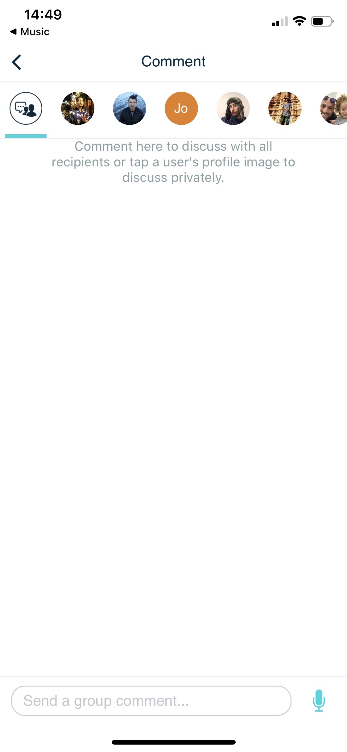Comment here to discuss with all recipients or tap a user's profile image to discuss privately.