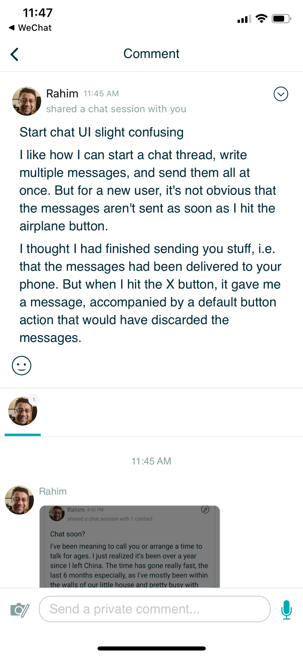 Comment here to discuss with all recipients or tap a user's profile image to discuss privately.