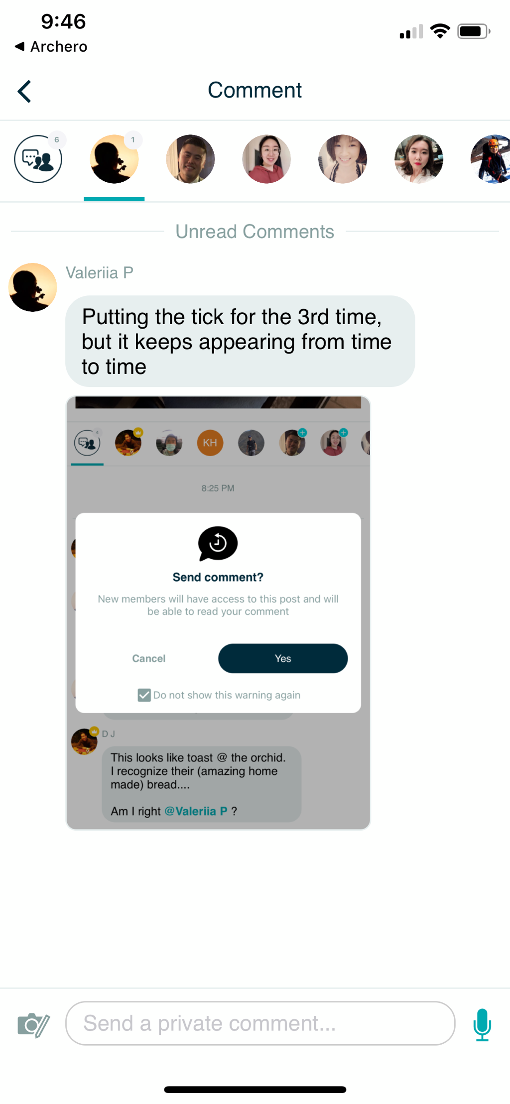 Comment here to discuss with all recipients or tap a user's profile image to discuss privately.