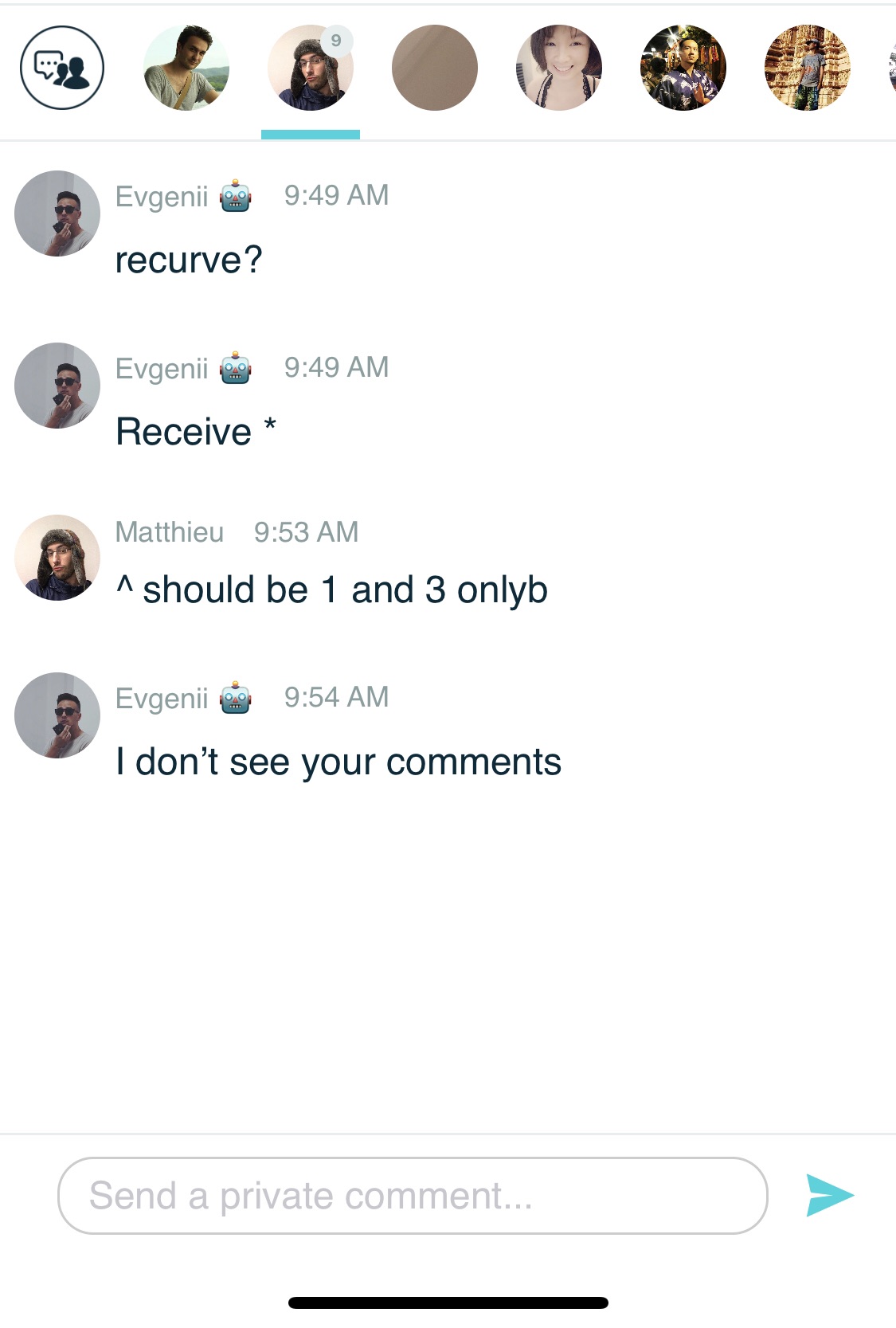 Comment here to discuss with all recipients or tap a user's profile image to discuss privately.