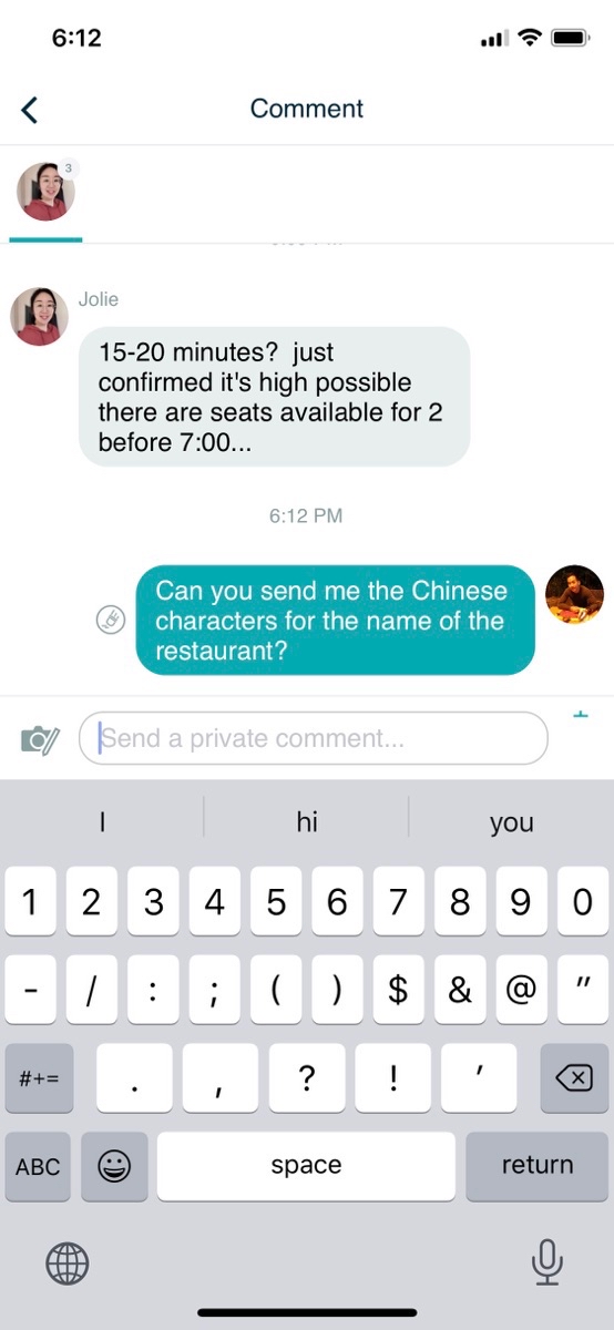 Comment here to discuss with all recipients or tap a user's profile image to discuss privately.