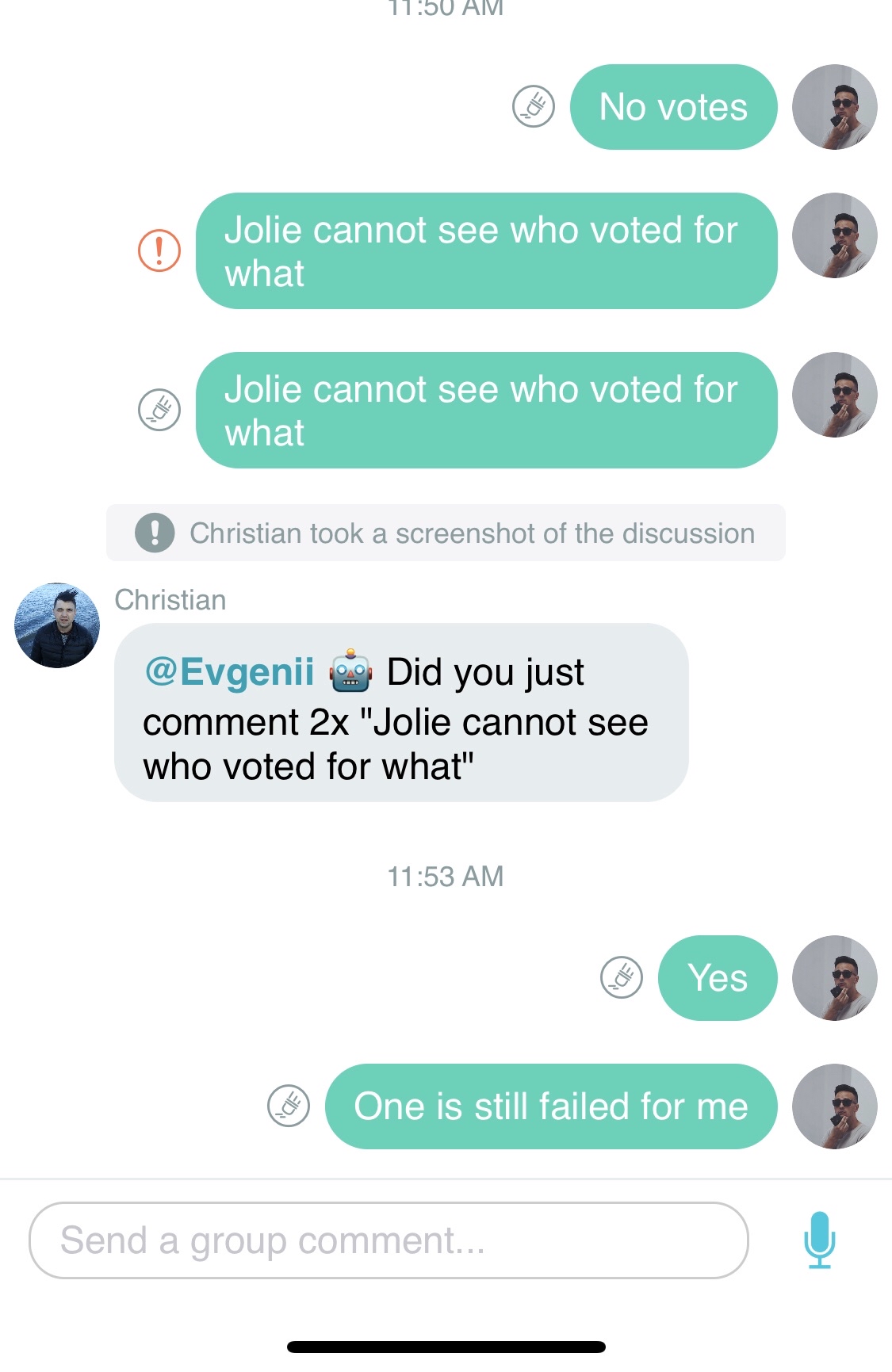 Comment here to discuss with all recipients or tap a user's profile image to discuss privately.