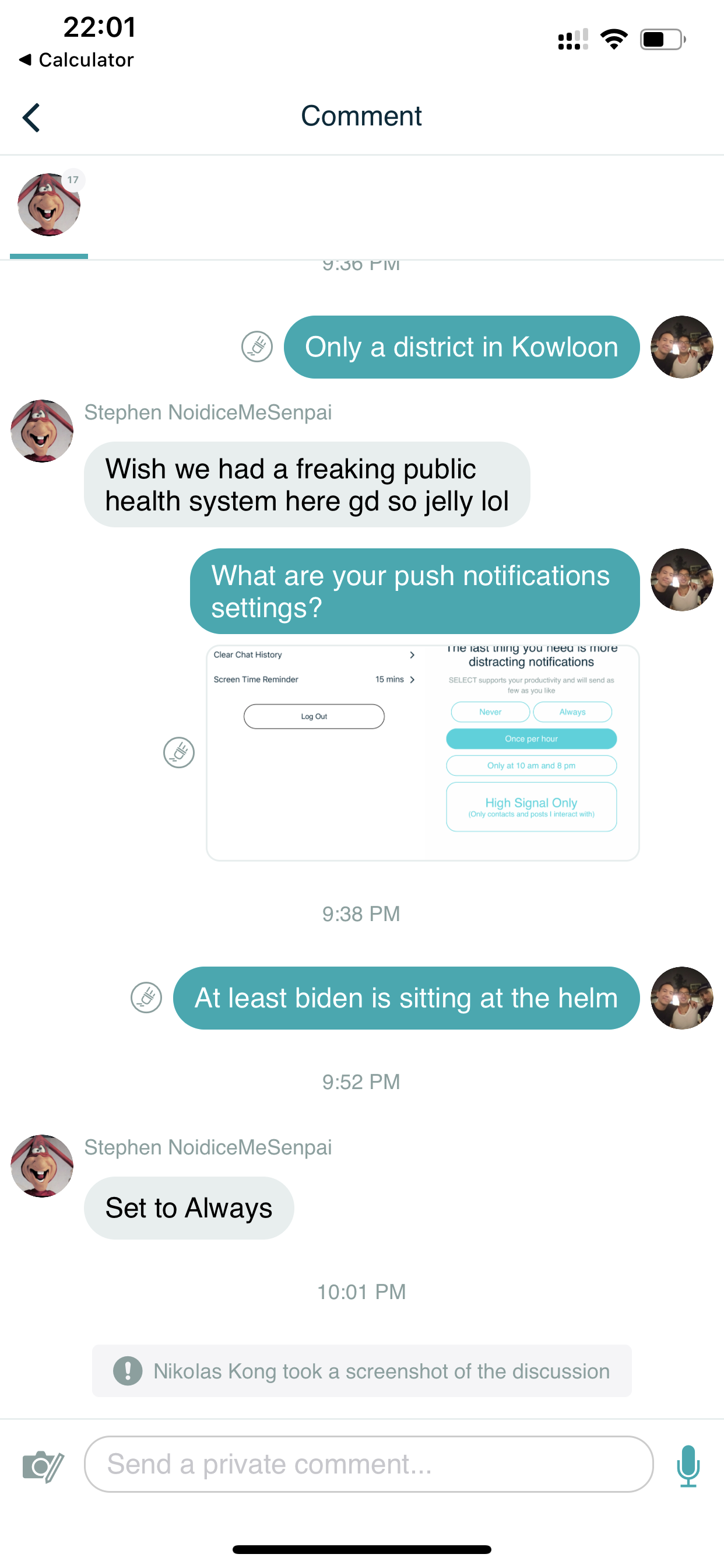 Comment here to discuss with all recipients or tap a user's profile image to discuss privately.