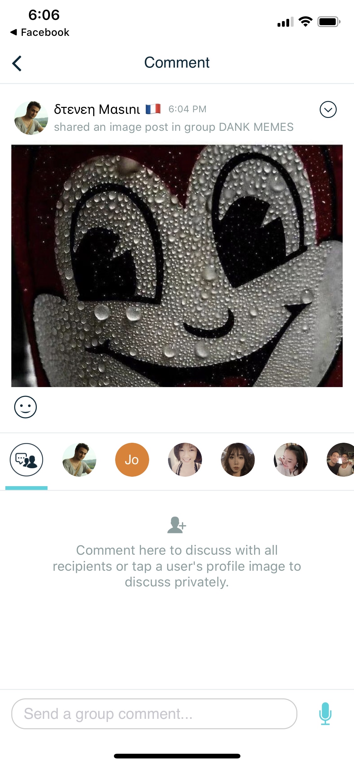 Comment here to discuss with all recipients or tap a user's profile image to discuss privately.