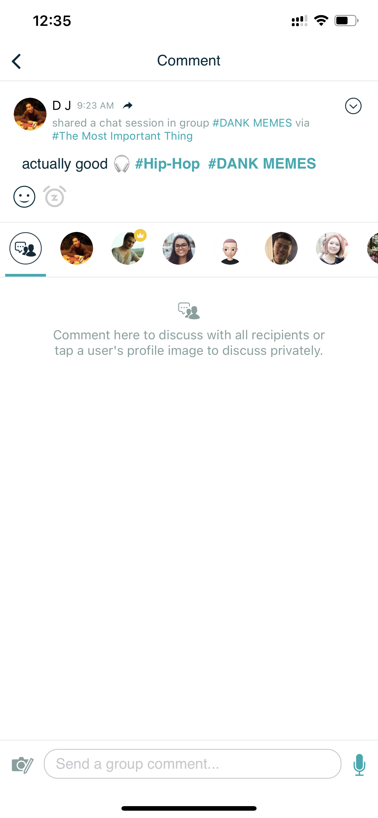 Comment here to discuss with all recipients or tap a user's profile image to discuss privately.