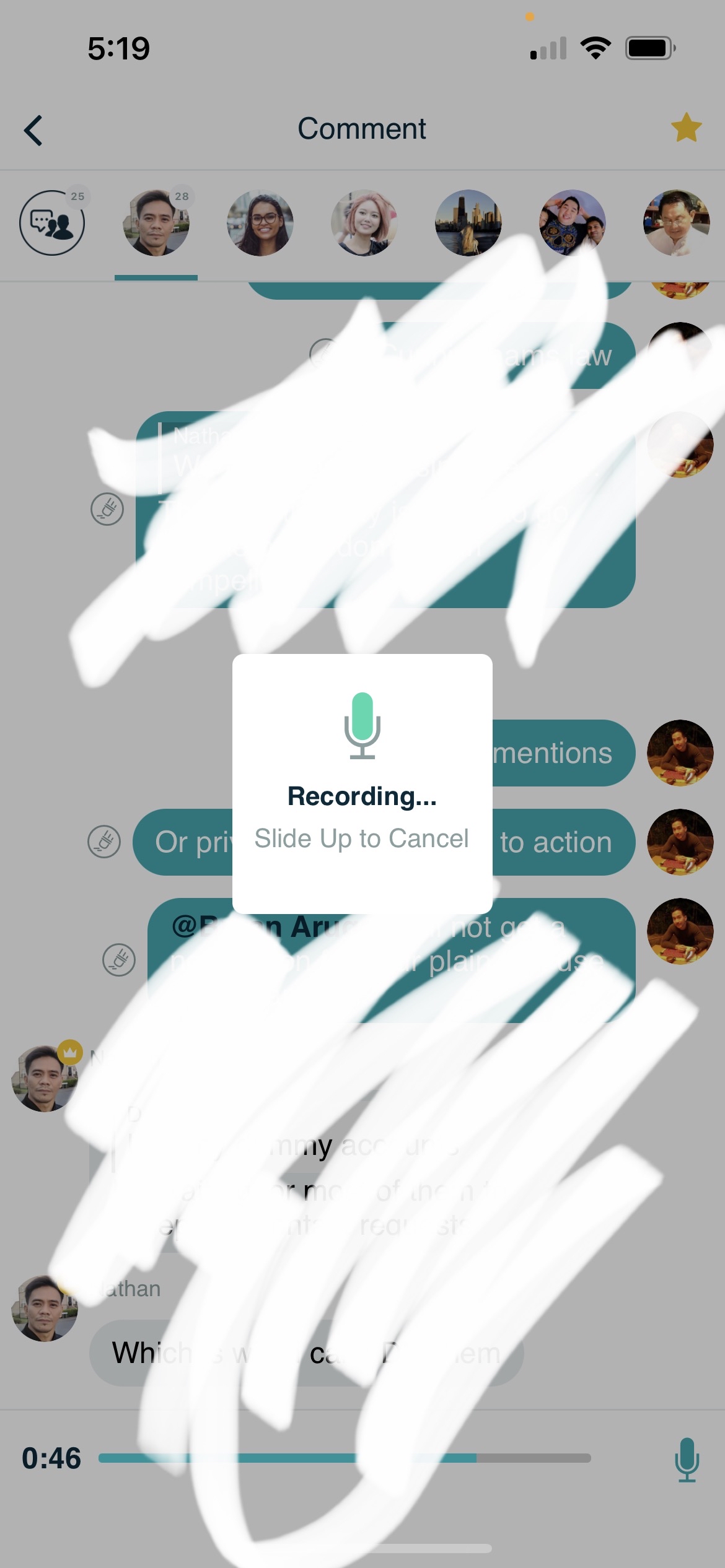 This modal often doesn’t go away after releasing the microphone button. We’ve had this issue for ages and it’s frustrating as it’s antithetical to its purpose of quick & easy. You have no choice but wait for it to go to the max (likely to erase) or kill the app to interact with it again. In both cases, if user doesn’t abandon, they have to redo (painful, and potential for bug to reoccur => degrading trust in using it)