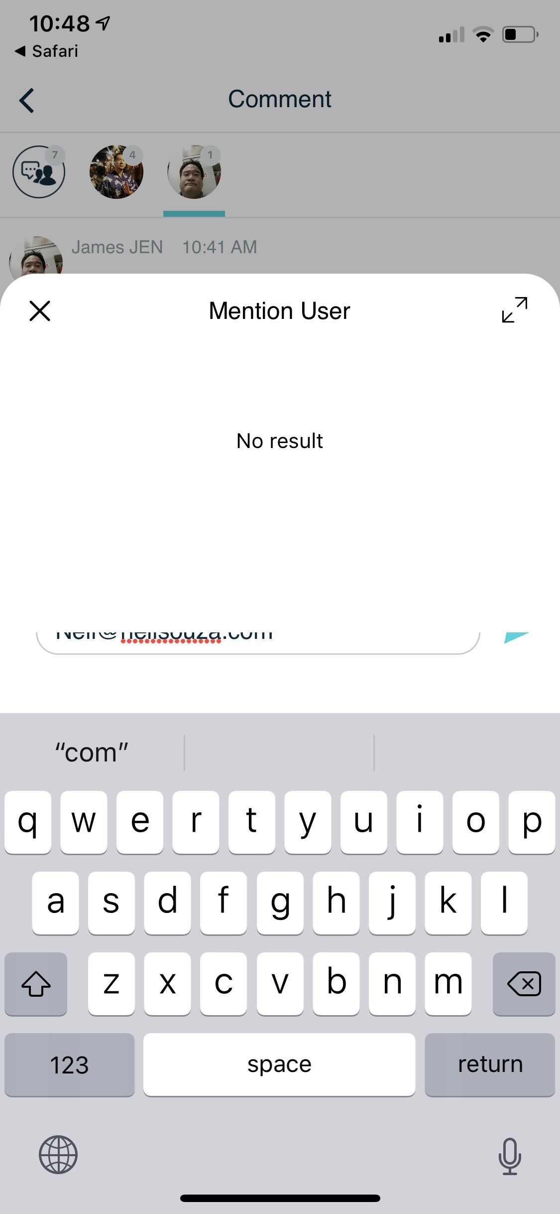 UI barf when typing an email address in, looks like app wanted to do a mention when it saw the ‘at’ symbol, but of course didn’t find anything, and thought it best to block out the text field among other things with a big “no results” overlay