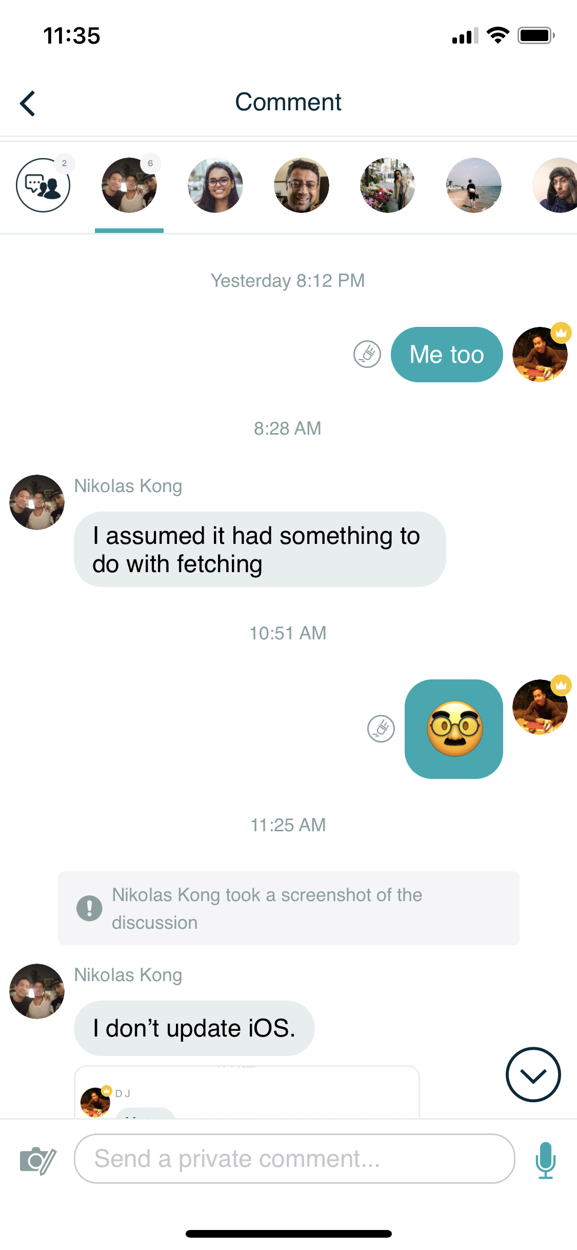 Comment here to discuss with all recipients or tap a user's profile image to discuss privately.