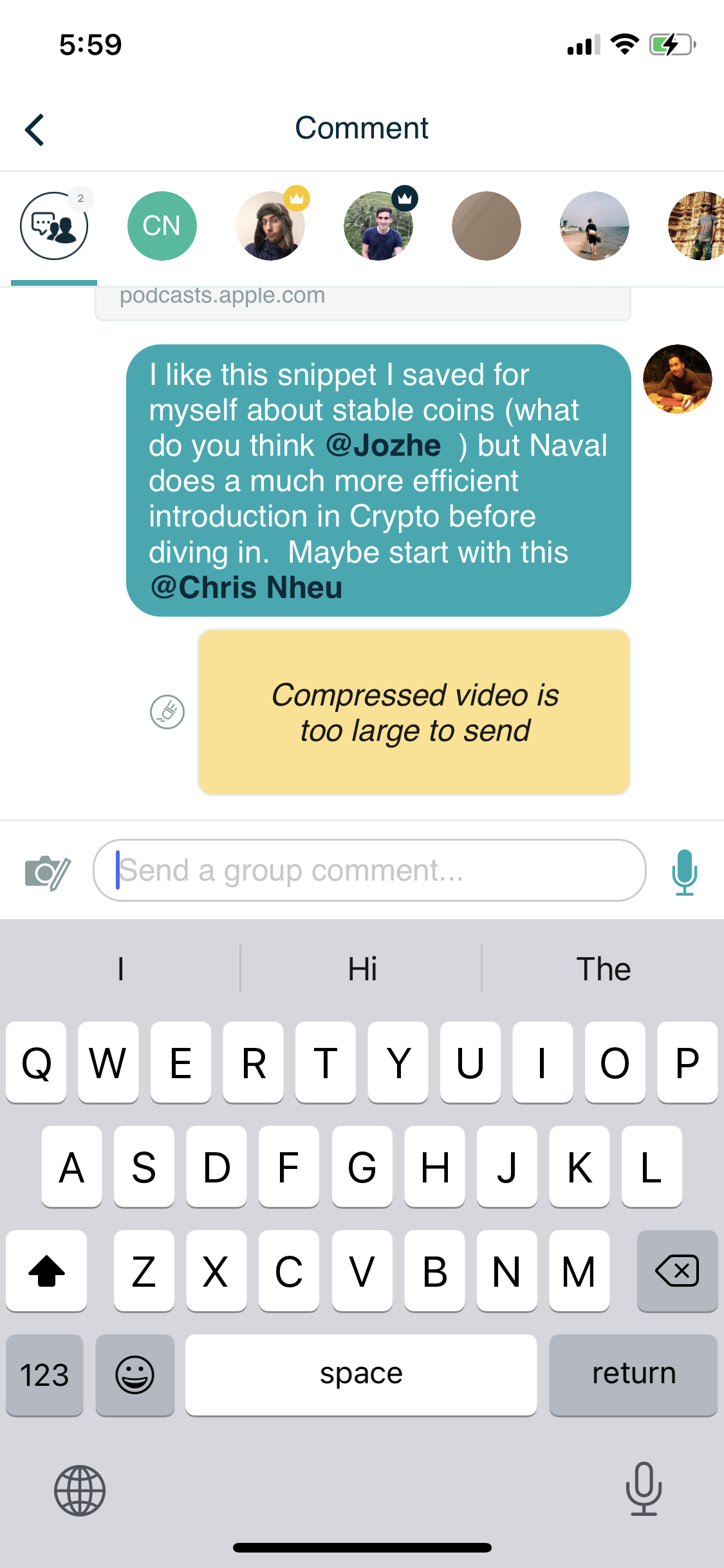 Comment here to discuss with all recipients or tap a user's profile image to discuss privately.