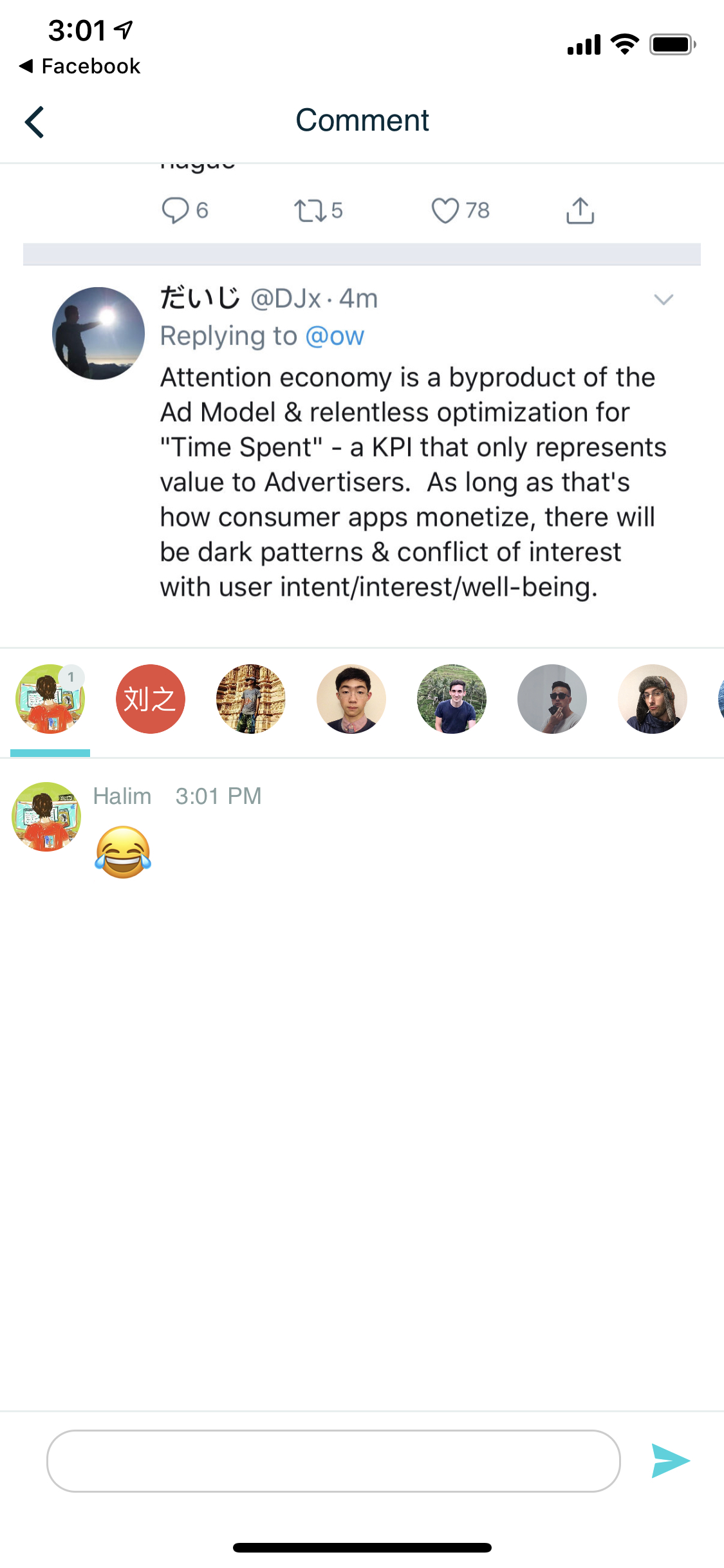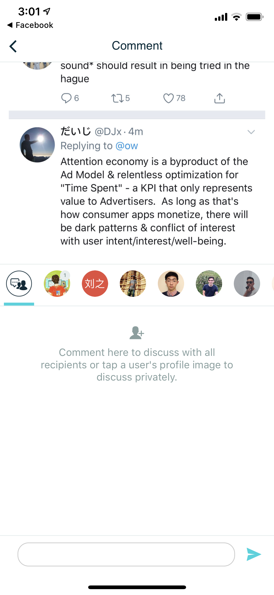 Comment here to discuss with all recipients or tap a user's profile image to discuss privately.