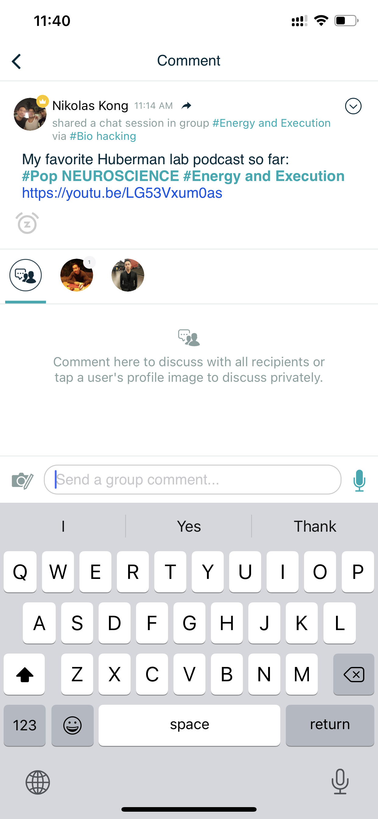 Comment here to discuss with all recipients or tap a user's profile image to discuss privately.