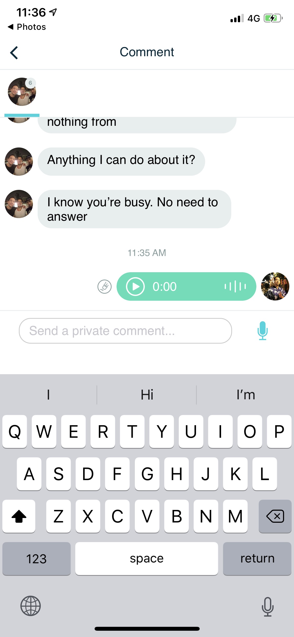 Comment here to discuss with all recipients or tap a user's profile image to discuss privately.