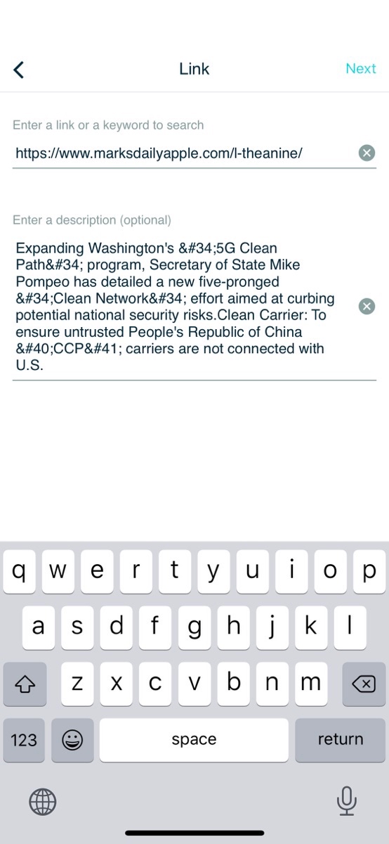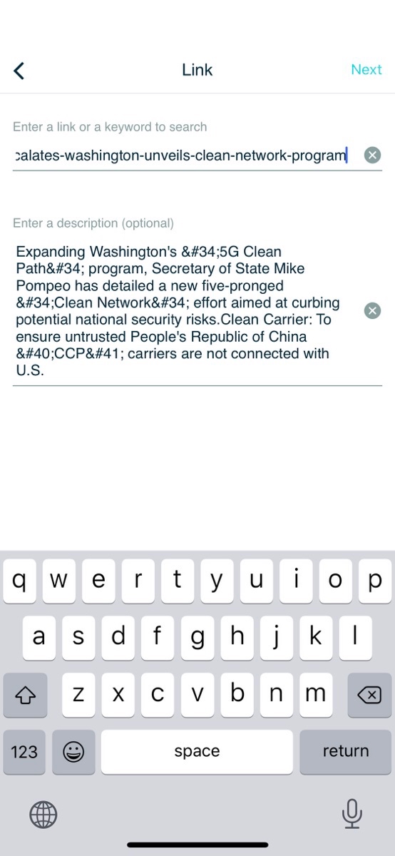 Zoom in - We’ve had this bug with lagging link loading from clipboard for a long time but if you hit the share button from in-app browser w: a *different link* on your clipboard, it will prepopulate that one first, load meta description for it, then replace it with the page you’re actually trying to share. Reproducible.